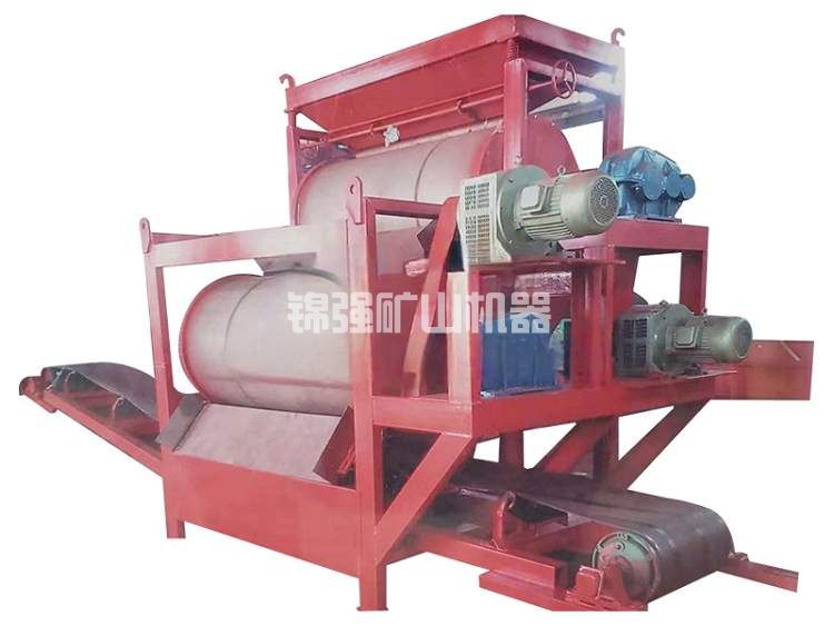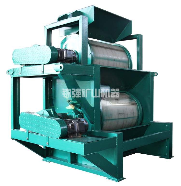 含有磁性物質(zhì)的非磁性物料經(jīng)過(guò)電磁振動(dòng)給料機(jī)均勻的分布到強(qiáng)磁雙輥干式磁選機(jī)皮帶上;當(dāng)物料通過(guò)強(qiáng)磁輥時(shí),磁性物質(zhì)由于受磁力的吸附作用被吸附到強(qiáng)磁輥上,被皮帶帶入磁性物料集料斗中;非磁性物料及未被選凈的磁性物料隨著皮帶的轉(zhuǎn)動(dòng)受重力作用,脫離磁場(chǎng)并下落到下一層皮帶上繼續(xù)選別;這樣,經(jīng)過(guò)幾道磁選之后就能選別出合格產(chǎn)品。